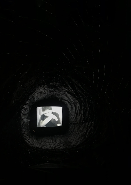 Труба из сетки, накрытая черной тканью, ведет прямо к телевизору, на котором проигрывается видео.