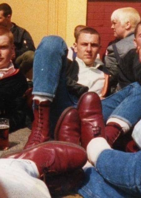 Архивное фото, почти все — в ботинках Dr. Martens с контрастными шнурками, джинсы подвернуты — фирменный приём скинхедов