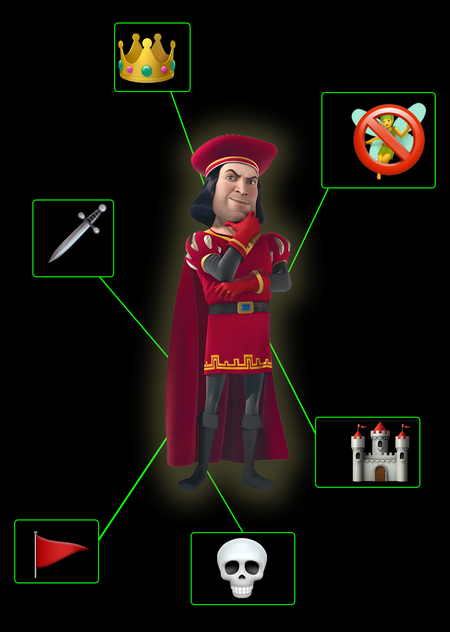 Кажется, теперь мы точно знаем, что Фаркуад не самый приятный тип и лучше обходить его стороной. Но возникает вопрос: а есть ли развитие у персонажа? На первый взгляд — нет: лорд как был мерзким злым коротышкой, так им и остается. Однако, его одержимость идеей и чувство безнаказанности все-таки прогрессируют. Если в начале фильма насилие Фаркуада остается за закрытыми дверьми подвала, то на свадьбе в порыве ярости он приставляет нож к горлу Фионы прямо на глазах горожан. Он жаждет стать королем, и уже ничто не остановит его.