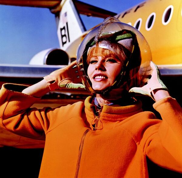 Марне Дэвис демонстрирует платье от дизайнера Эмилио Пуччи из коллекции Supersonic Derby (1966 г.) и пластиковую шляпу Gemini IV Raindome (1965 г.)