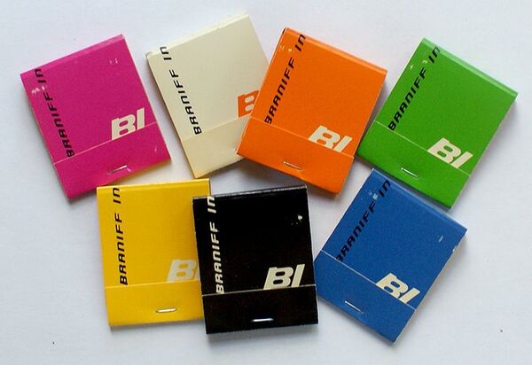 (1) Униформа Braniff Airways (2) Спичечные коробки Braniff Airways из рекламной кампании «Конец простого самолёта» (1967 г.)