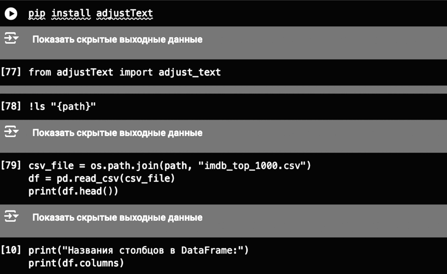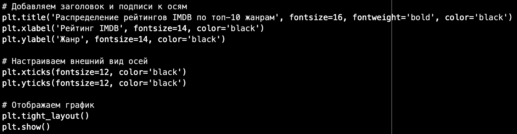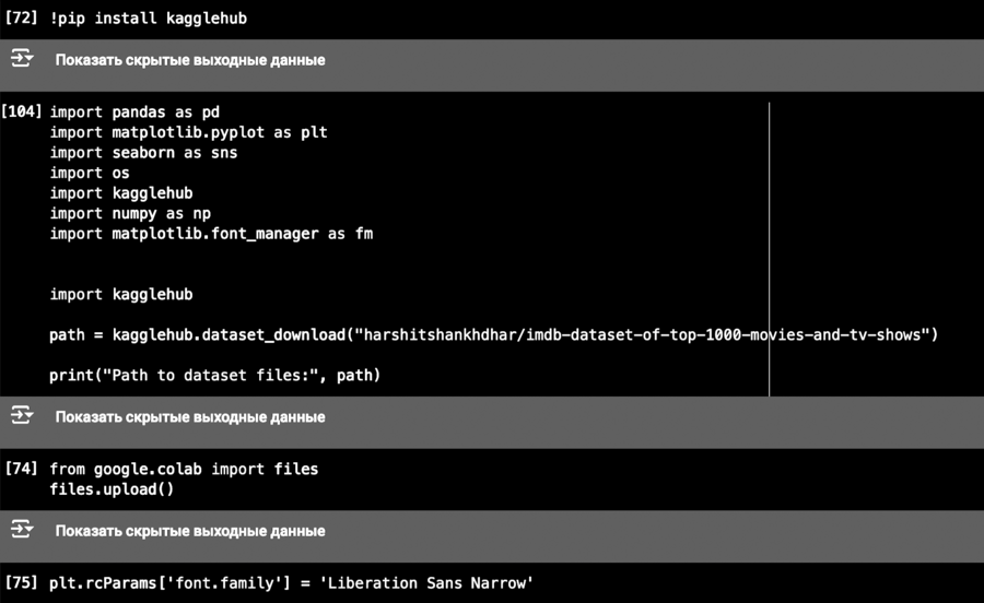 Перед началом работы над графиками я установила необходимые библиотеки и импортировала инструменты для анализа и визуализации данных. Затем загрузила набор данных IMDb через kagglehub, настроила шрифт для графиков и проверила структуру данных в DataFrame.