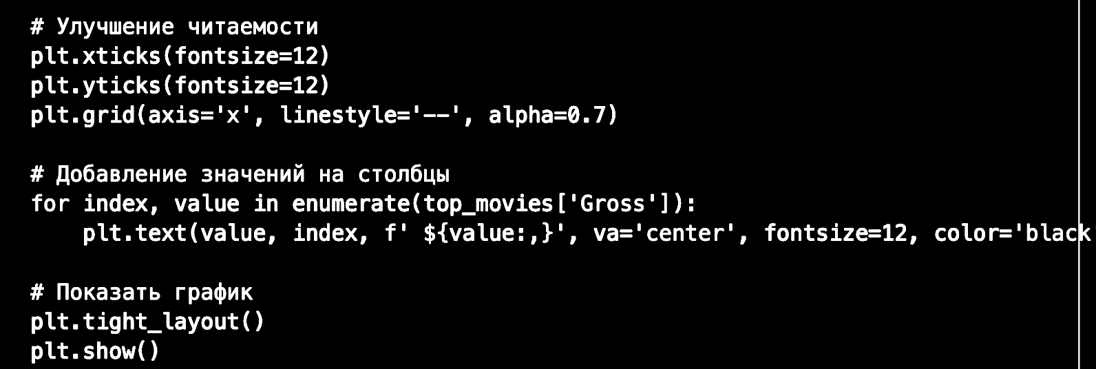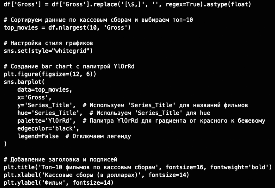 Для создания графика я очистила данные о кассовых сборах, преобразовав их в числовой формат, выбрала топ-10 фильмов по сборам и построила столбчатую диаграмму с помощью seaborn. На графике видно, что Star Wars: Episode VII — The Force Awakens лидирует по кассовым сборам, за ним следуют Avengers: Endgame и Avatar. Такая диаграмма позволяет мне легко сравнить успешность фильмов и выделить лидеров.