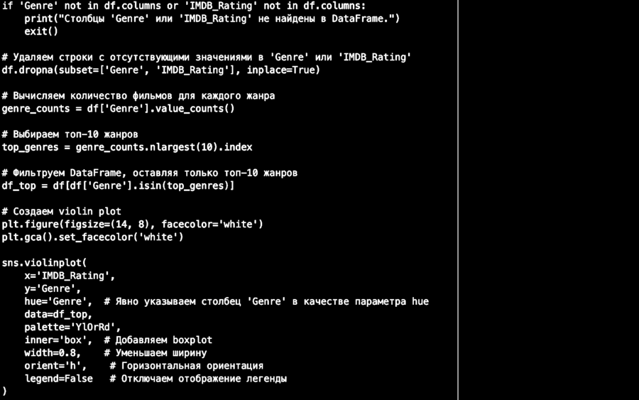 Я анализирую распределение рейтингов IMDB по топ-10 жанрам. Сначала я проверяю наличие столбцов 'Genre' и 'IMDB_Rating' в DataFrame и удаляю строки с отсутствующими значениями. Затем я определяю топ-10 жанров по количеству фильмов и фильтрую данные, оставляя только эти жанры. После этого я создаю violin plot для визуализации распределения рейтингов IMDB по выбранным жанрам, добавляю заголовок и подписи к осям, чтобы график был понятным и информативным. График позволяет мне увидеть, как рейтинги распределены внутри каждого жанра и сравнить их между собой.