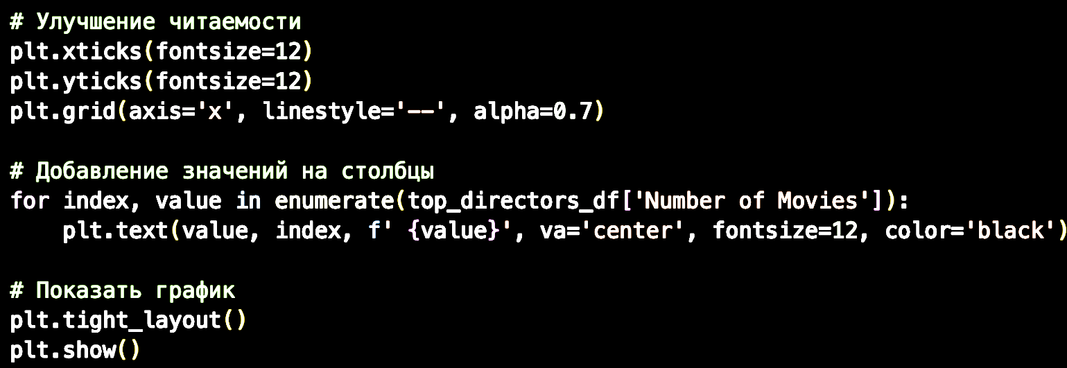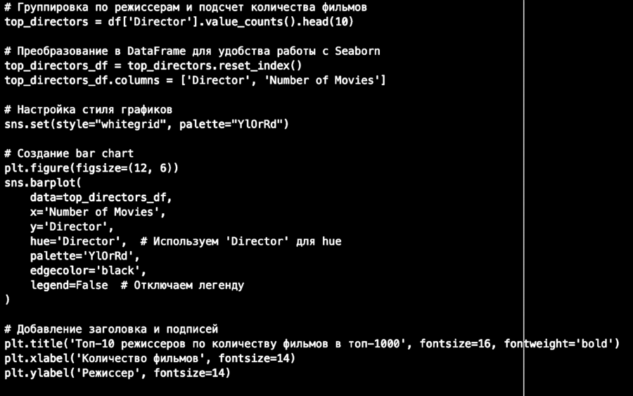 Тут я анализирую топ-10 режиссеров по количеству фильмов в списке топ-1000 IMDb. Сначала я подготавливаю данные, создавая DataFrame с именами режиссеров и количеством их фильмов. Затем я настраиваю стиль графиков с помощью seaborn и создаю bar chart (столбчатую диаграмму), чтобы визуализировать эту информацию. На графике я добавляю заголовок, подписи осей и значения на столбцы для улучшения читаемости. Данный график позволяет мне наглядно увидеть, какие режиссеры чаще всего представлены в топ-1000, и сравнить их между собой.