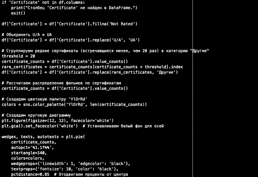 Для создания круговой диаграммы я анализирую распределение фильмов по сертификатам в IMDb. Заменяю пропуски на 'Not Rated', объединяю похожие сертификаты и группирую редкие в «Другие». Создаю круговую диаграмму с цветовой палитрой 'YlOrRd', добавляю легенду и заголовок. Это помогает мне визуализировать, какие сертификаты наиболее распространены.