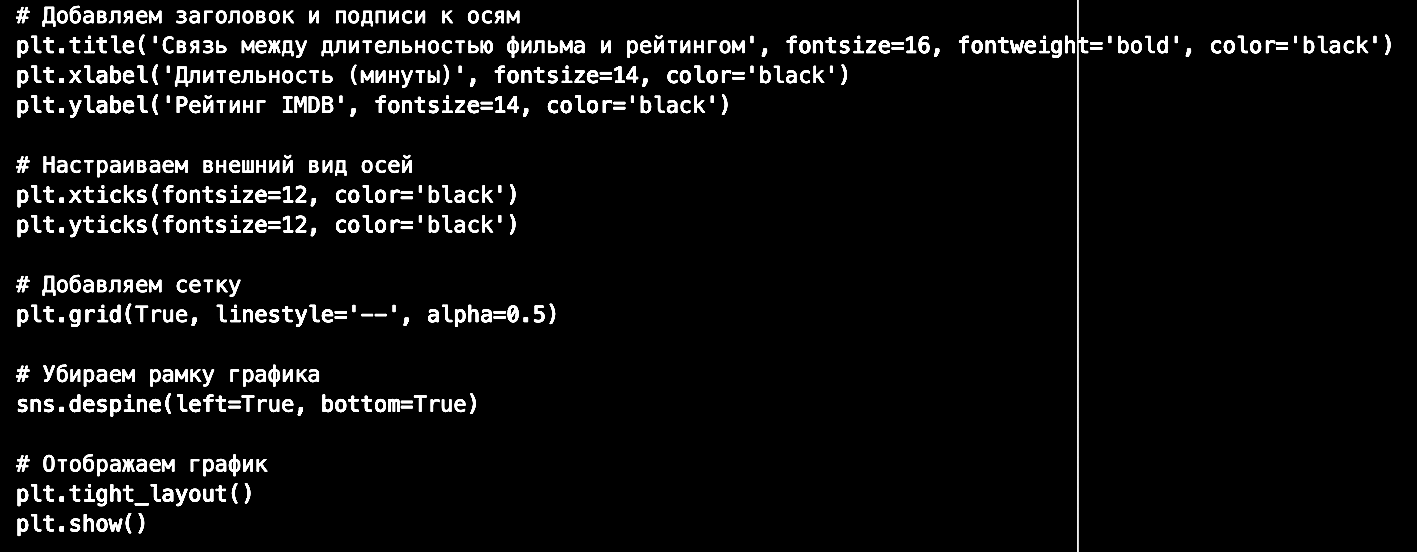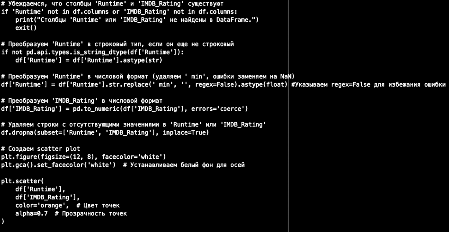 Тут я анализирую связь между длительностью фильмов и их рейтингом IMDB. Сначала я проверяю наличие столбцов 'Runtime' и 'IMDB_Rating', преобразую их в числовой формат и удаляю строки с пропущенными значениями. Затем я создаю scatter plot (точечный график), чтобы визуализировать зависимость между длительностью фильма и его рейтингом. На графике я добавляю заголовок, подписи осей, сетку и настраиваю внешний вид ёдля улучшения читаемости. Данный график позволяет мне увидеть, есть ли связь между продолжительностью фильма и его оценкой.