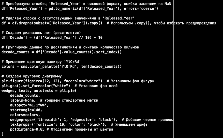 Тут я анализирую распределение фильмов по десятилетиям выпуска. Сначала я преобразую столбец 'Released_Year' в числовой формат и удаляю строки с пропущенными значениями. Затем я создаю диапазоны лет (десятилетия) и группирую данные по ним, чтобы посчитать количество фильмов в каждом десятилетии. После этого я создаю круговую диаграмму с использованием цветовой палитры 'YlOrRd', добавляю легенду, заголовок и настраиваю отображение процентов для улучшения читаемости. Круговая диаграмма позволяет мне наглядно увидеть, как количество фильмов распределено по десятилетиям.