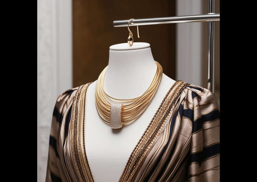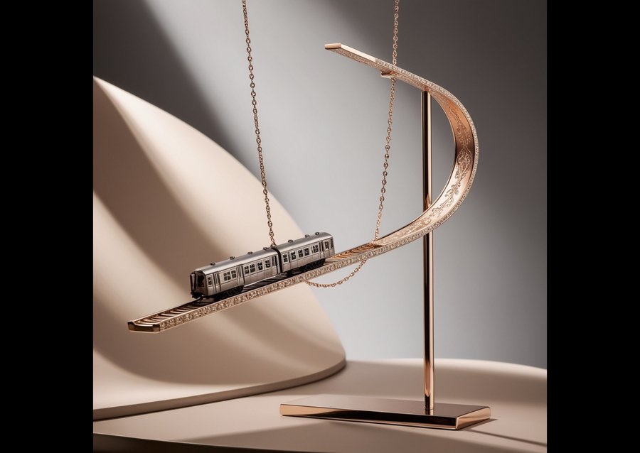 A lavish, high-fashion photography setup featuring a breathtaking necklace suspended from a sleek, modern stand, showcasing exquisite attention to detail. The necklace takes the form of a delicate parabolic-shaped rail embellished with intricate engravings, supported by a slender chain. Perched upon the rails is a minuscule, accurately detailed subway train, complete with tiny windows and precise metal textures. The overall aesthetic is one of opulence and sophistication, evoking the world of haute couture. The photography style is characterized by soft, wrapping light, subtle shadows, and a warm, muted color palette, emphasizing the luxurious materials and craftsmanship of the necklace. The background is a subtle, gradient gray, allowing the necklace to take center stage, while the overall composition is balanced and harmonious, with a sense of depth and dimensionality.