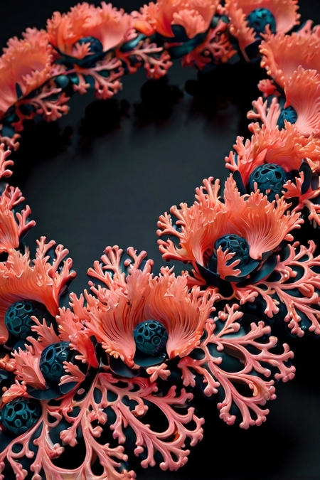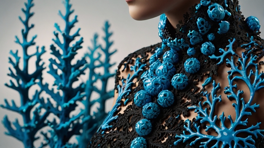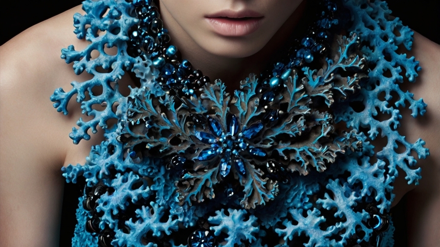 An ornament that is hung around the neck. it looks like corals. The core is blue and the edges are black. It goes asymmetrically down the body