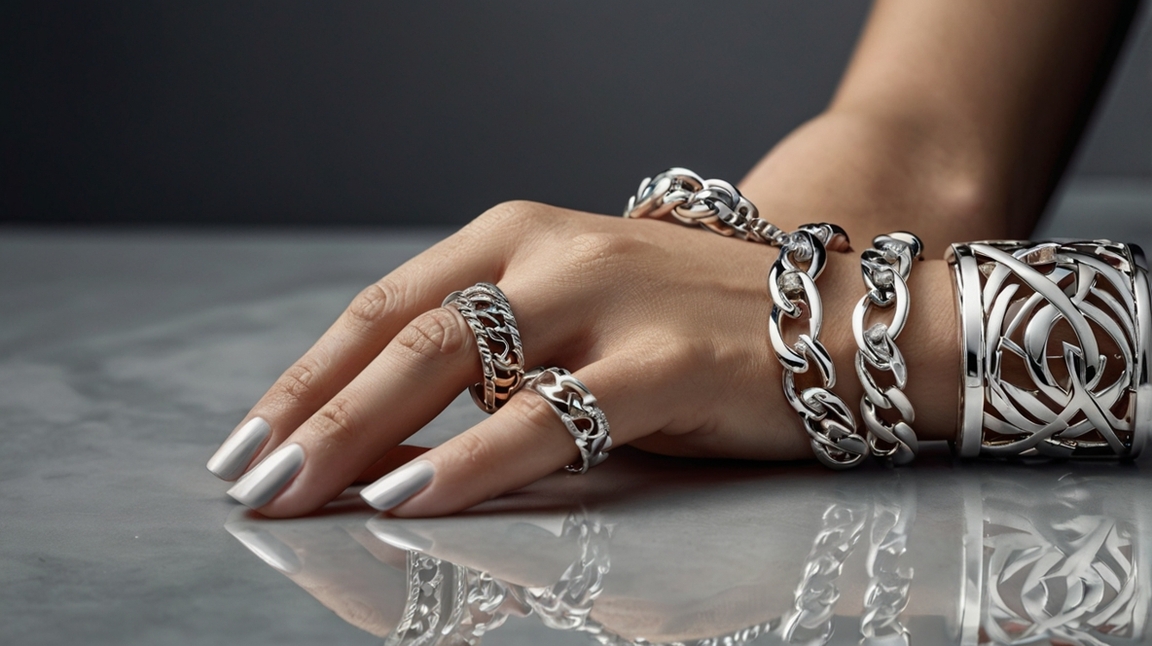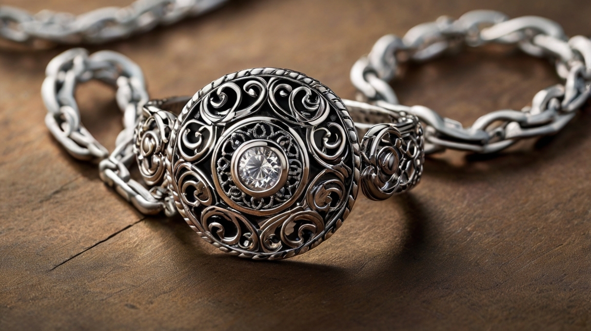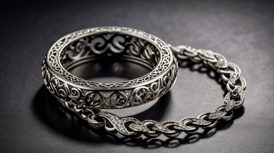 A delicately adorned silver ring and bracelet with intricate embossed patterns catch the light with a subtle elegance. Two delicate chains delicately connect the ring to the bracelet, adding a touch of whimsy to the set. This beautifully crafted jewelry set is depicted in a photograph, showcasing the precise details and luxurious design. Each piece gleams with a polished finish, exuding a sense of sophistication and luxury. The image perfectly captures the exquisite craftsmanship and timeless beauty of this stunning jewelry set.