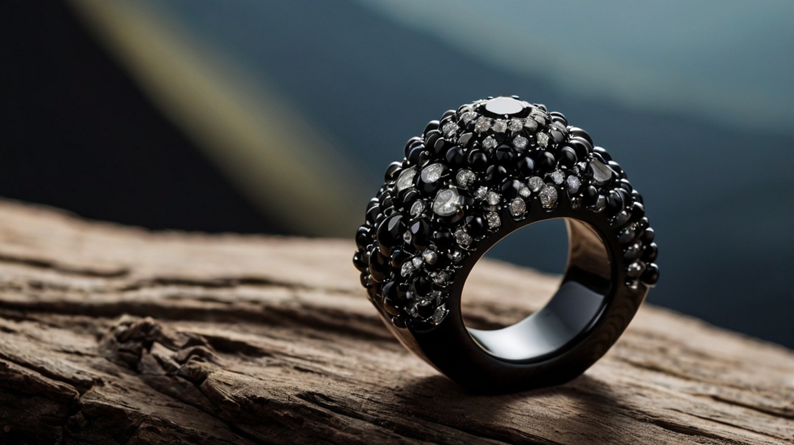 A piece of jewelry hanging on a stand. black ring looking like a mountain