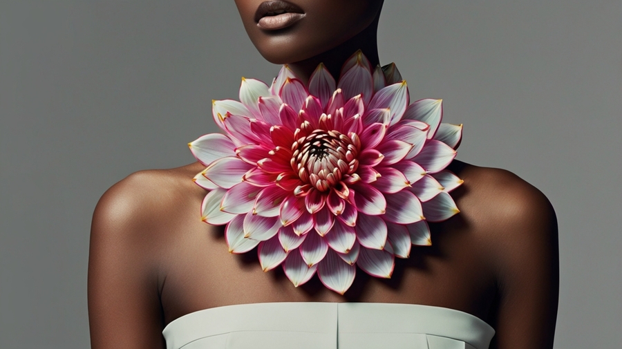A vibrantly blooming flower adorns the neck, resembling a regal collar. The detailed petals burst with life, painted in a bright yet elegant color scheme. The image, likely a painting, showcases intricate brushwork and attention to detail. Every petal is carefully rendered, adding depth and dimension to the overall composition. This stunning piece of art exudes elegance and sophistication, captivating viewers with its exquisite beauty and refinement.