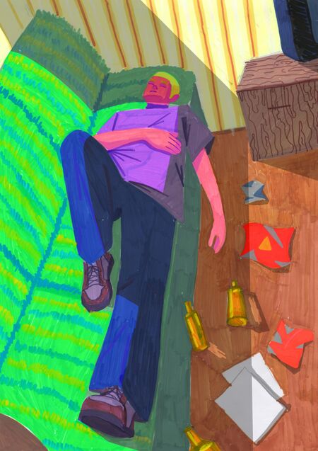Концепция иллюстраций это повседневная жизнь персонажа, живущего в трейлере. Как он спит после выпивки, как заглядывает в холодильник, в тесно обставленном пространстве, и как ругается с женой за столом.