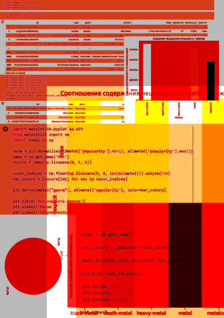 Для оформления я взяла красные агрессивные оттенки и черный, которые скорее всего ассоциируются с таким жанром. Также для этого я использовала цветовую палитру «hot» из библиотеки colormaps.