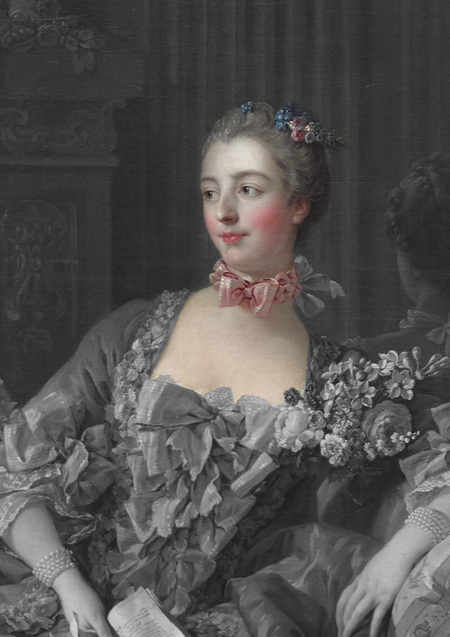 Буше часто использовал мягкие, приглушённые тона, создавая ощущение лёгкости и тепла. На этой картине пастельные оттенки розового и голубого придают изображению особую женственность и чувственность, характерные для рококо.