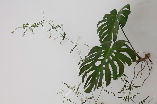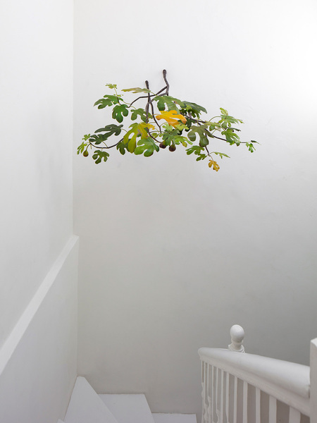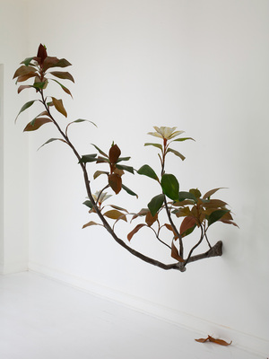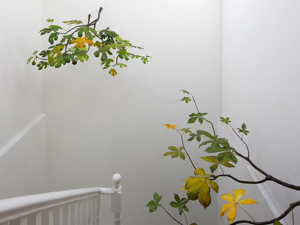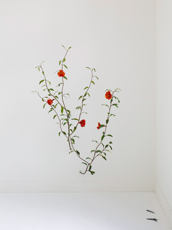 Пустые белые стены из которых растут хрупкие ветви растений которые бережно изготовлены автором.
