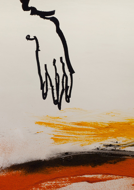 Рука, едва касаясь пола осыпается. Мы можем видеть что пряности, которые находятся на полу, по ним уже провел кто-то рукой. Будто композиция ожила.