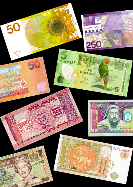 Гульдены Нидерландов, в частности, имеют более сдержанные (по сравнению с Фиджи) цветовые решения. Обычно используются зеленые, коричневые и синие оттенки. Монгольские тугрики также обладают своей уникальной цветовой гаммой.