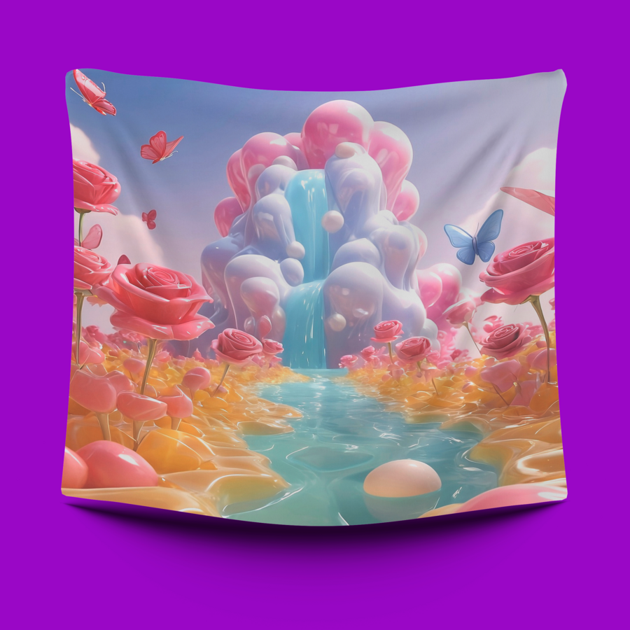 Промпт: 3d gelly sweets fantasy world paradise with waterfall, gelly land or grass and levitating butterflies, serene sky with clouds, blooming roses flower shaped gellies Референс: https://www.dropbox.com/scl/fi/3qf9m4jvxh1vt5fzdef68/2.png?rlkey=9vqxko0yq4751x2hkwv0kts1i&st=e1k188fp&dl=0