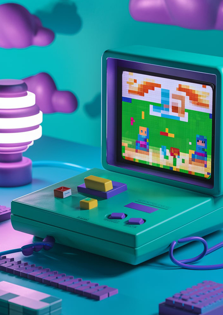 Промпт: «A vibrant and immersive digital artwork in a bright cyan color palette with purple accents, inspired by vintage video games».
