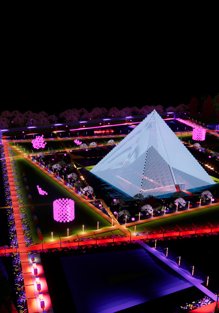 В проекте я хотела передать четкую геометрию парка, которая визуально связывается с начертаниями, которые Ричард Анушкевич использует в своих картинах. Я также постаралась создать эффект пикселизации, распада всех форм на мелкие квадраты, что отсылает нас к работам художника. Парк разбит на тематические зоны. Фирменные фонари, скамейки и другие элементы оформления дополняют его оригинальность.