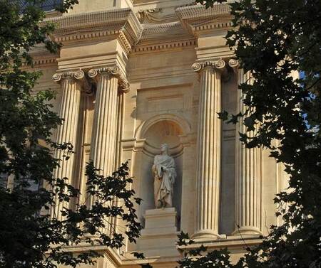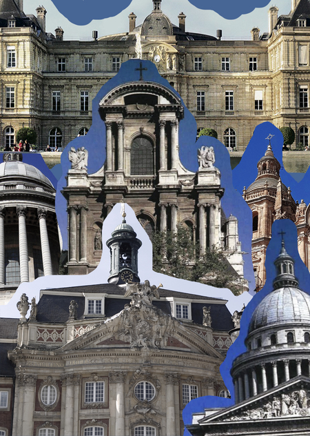 Архитектура Французской академии (Академия изящных искусств), которая стала символом охраны труда и контроля над искусством, солнечностью и строгостью классицизма с элементами барокко. Здание выделяется своей монументальностью. Фасад Академии отличается четкой структурой, где колонны и пилястры коринфского ордера подчеркивают вертикальные линии и создают эффект увеличения. Центральный портал украшен массивным фронтоном с рельефами, символизирующими триумф искусства и науки, которые отражают повороты Академии в культурной жизни Франции.