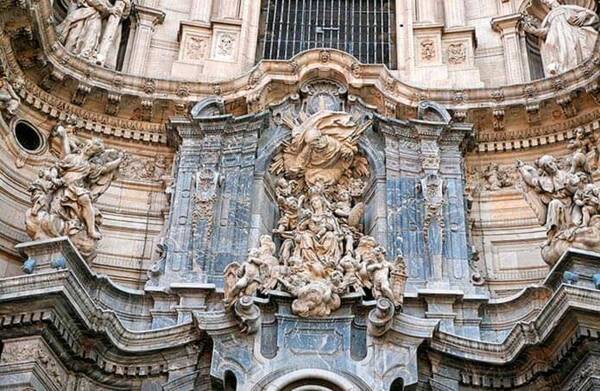 Кафедральный собор в Мурсии представляет собой последний архитектурный ансамбль, сочетающий в себе элементы готики, ренессанса и барокко. Его фасад, признанный одним из самых впечатляющих образцов испанского барокко, отличается сложной композицией с богато декорированными элементами и объемными игровыми объемами. Центральная часть фасада украшена большим барочным порталом с резьбой и скульптурами святых, выполненными с изумительной детализацией. Над порталом возвышается сложный фронтон, дополненный изящными завитками и статуями, создающими иллюзию движения. Особое внимание привлекают скульптурные группы и рельефы, изображающие сцены из Священного Писания и консервативных персонажей. Эти декоративные декорации создают ощущение драмы и одухотворенности, которые подчеркивают духовное значение собора. Орнаментальная обработка поверхности стены придает визуальную насыщенность и отсылает к традициям испанского искусства.