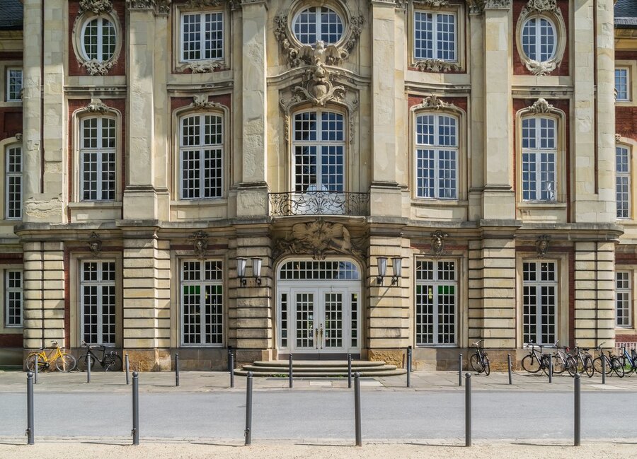 Иоганн Конрад Шлаун разработал генеральный план строительства дворца, который предусматривал не только само здание, но и комплекс служебных и хозяйственных построек, а также разбивку большого парка во стиле. Декоративные элементы, такие как карнизы, пилястры и оконные обрамления, выполнены из светлого горного песчаника Баумберга, который часто используется в архитектуре Мюнстера и имеет развитое направление в Вестфалии. Архитектура дворца отличается строгой симметрией относительно центральной оси. Здание, вытянутое с севера на юг, включает в себя два восточных флигеля, образующих парадный двор. Центральный фронтон, завершающий ризалит, украшен фонарем с колоколом и флюгером. Колокол воспроизводит одну из десяти мелодий трижды в день и отбивает каждую четверть часа.