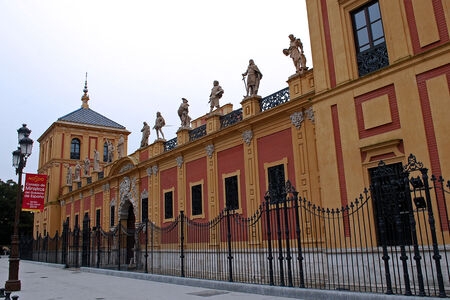 Дворец Сан-Тельмо создан в эпоху позднего севильского барроко и главный портал удивляет своей необычной барочной архитектурой в стиле чурригереско, который был пристроен позже основного здания в 1754 году и украшает фасад статуя из белого камня Святого Тельмо, который является в Испании покровителем всех мореплавателей. Строительство основного здания началось в 1682 году как навигационной школы для детей сирот из семей моряков и разработкой проекта занимался зодчий Леонардо де Фигероа и в последствии его сын и внук. По углам прямоугольного бежево-терракотового здания виднеются башни с изящными шпилями, внутри Сан-Тельмо просторные дворы с апельсиновыми деревьями. В центре расположена церковь. 12 статуй знаменитых жителей Севильи украшают фасад дворца. В 19 веке скульптор Антонио Сусильо изобразил искусство и науку между колонами поставив ряд скульптур.