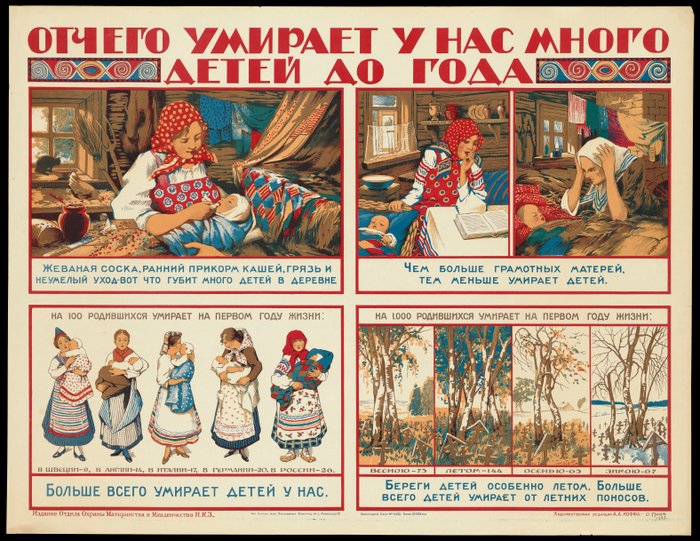 1. 1925. Советский плакат «Что должна знать каждая женщина» издания Отдела Охраны Материнства и Младенчества Н.К.З. Медицина. Художник О. Грун 2. 1925. Советский плакат «Отчего умирает у нас много детей до года» издания Отдела Охраны Материнства и Младенчества Н.К.З. Медицина. Художник О. Грун