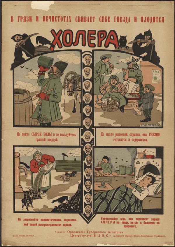 Слева: В грязи и нечистотах свивает себе гнёзда и плодится холера. Художник С. Погорельский. Орёл, 1910-е годы
