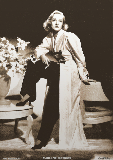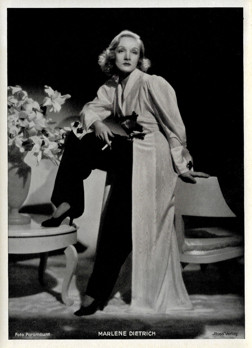 Актриса Марлен Дитрих, которая, как и Шанель, внесла значительный вклад в популяризацию образа женщины в штанах, сделала ношение смокинга, сшитого по индивидуальным меркам, своим фирменным символом.