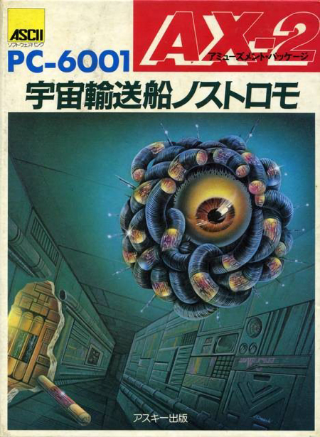 Обложка (слева) и скриншоты (справа) из игры AX-2: Uchuu Yusousen Nostromo (ASCII Entertainment Software, Inc., 1981)
