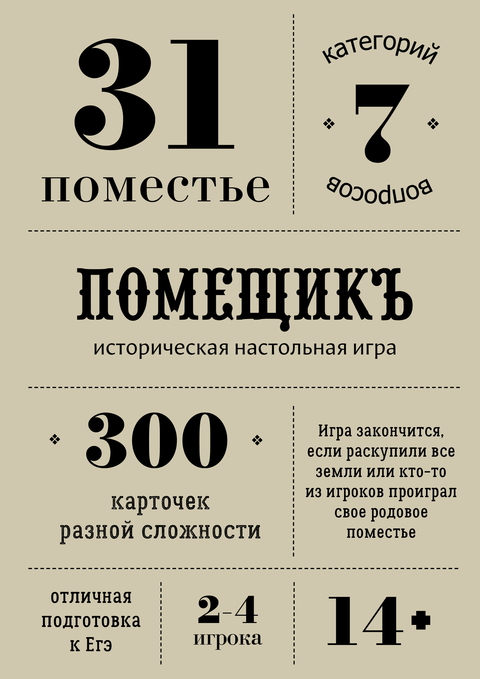 Вы не только узнаете, смогли бы вы стать успешным помещиком, а также вспомните истории России XIX века. Ваша задача — приумножить стартовый капитал и обойти соперников. А помогут в этом знания и владение тактикой!