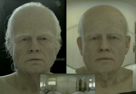 Помимо шейдеров для кожи использовались карты смещения с трассировкой лучей в Mental Ray, созданные с макетов, для детализации неровностей и дефектов. Задачей было синхронизировать работу рейтрейсинга, карт смещения, подповерхностного рассеивания и глобального освещения [6].