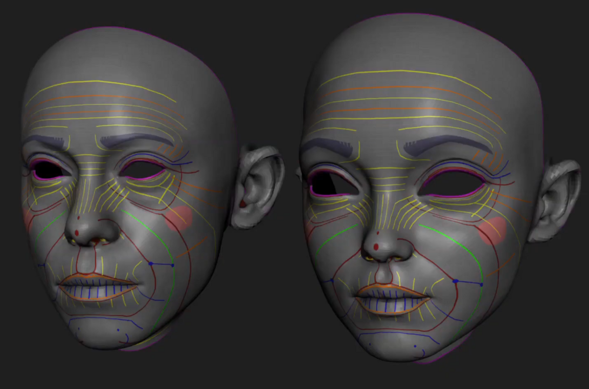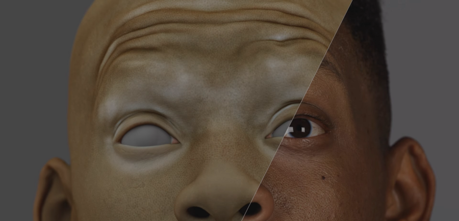 Displacement или карта смещения — это черно-белая текстура, которая применяется для создания эффекта рельефа или деформации на поверхности объекта, меняя его геометрию. То есть все многообразие впадин и выпуклостей. И у всего лица (скулы, глазницы), и у морщин, и даже у пор, расположение и форма которых крайне важна. Студия «Weta Digital» вместо того, чтобы делать их алгоритмически, что сразу бы дало ненатуральный эффект, использовали AI инструмент, работающий с симуляцией массивов [4]. Глубокое обучение позволило создать неповторимый оригинальный паттерн пор на коже.