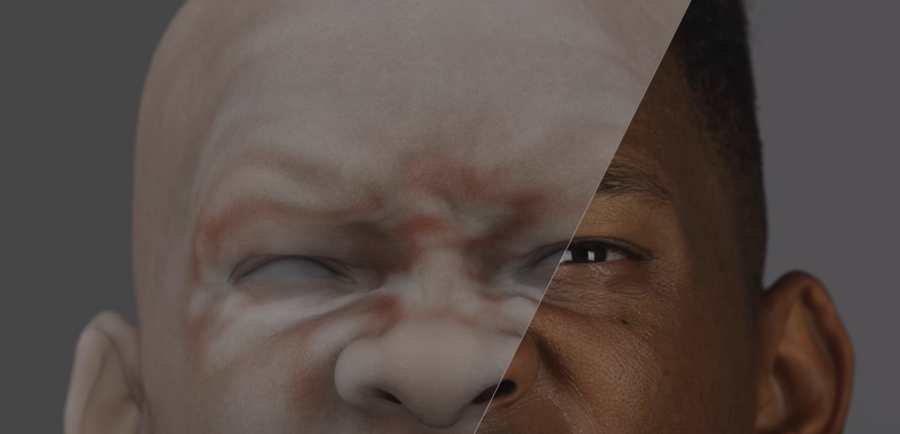 Следующая важная часть — подповерхностное рассеивание или SSS. Сложность воссоздания человеческой кожи еще и в том, что она неоднородна: некоторые участки толще других, свет в них отражается по-разному, лучи попадают не только на поверхность кожи, но и под нее, отражаясь оттуда. Более того, рассеивание тоже неоднородно. Эта задача также была решена с помощью глубокого обучения AI инструмента, который учитывал уровень меланина, влияющий на SSS, и для каждого участка кожи определял, какое необходимо количество подповерхностного рассеивания [4]. Но перед этим явление было изучено и описано в статье Хенриком Ванн Йенсеном из компании «Luxion»: с помощью лазерной указки, просвечивая различные продукты в супермаркете, они с командой выяснили подробности о том, как свет проходит сквозь материю, а не просто отражается от нее [5].