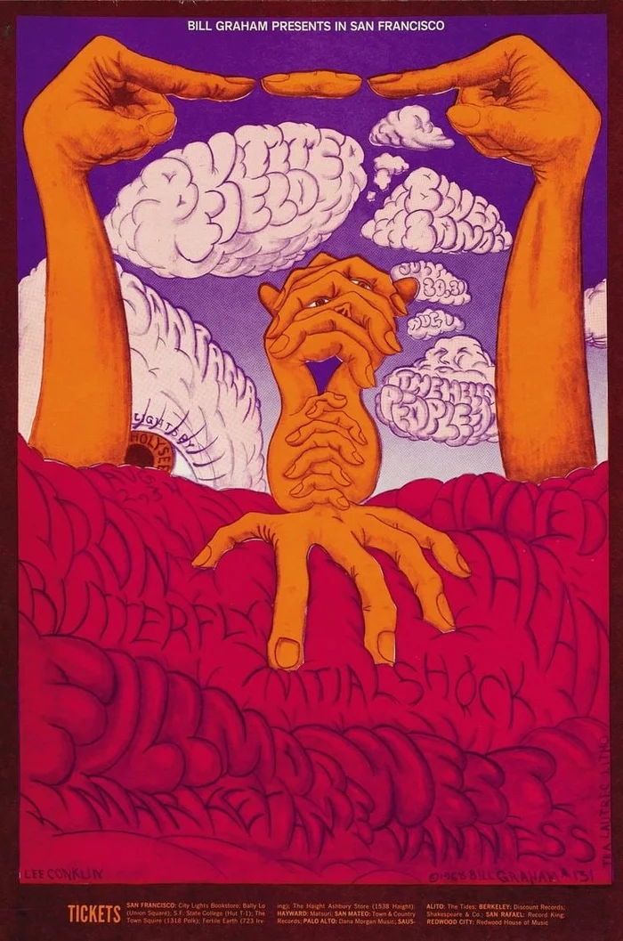 Ли Конклин — известный американский художник и иллюстратор, который стал известен своим вкладом в психоделический дизайн в 1960-х годах, в большей степени он занимался дизайном плакатов для музыкальных групп, а также обложек для альбомов. Его дизайн отличался уникальным стилем, основными характеристиками которого можно назвать сложные и детализированные паттерны, органические формы и запутанные линии. Его работы часто включали фантастические и абстрактные элементы, создавая ощущение галлюцинаций и мистической энергии.