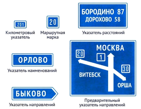 Предписывающие и указательные знаки приобрели характерный синий цвет. Форма указательных знаков стала прямоугольной или квадратной.