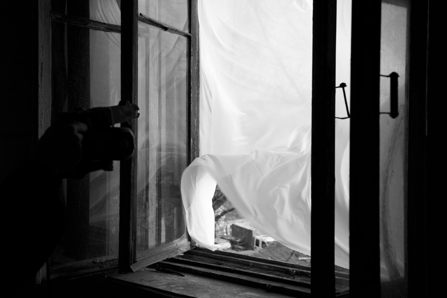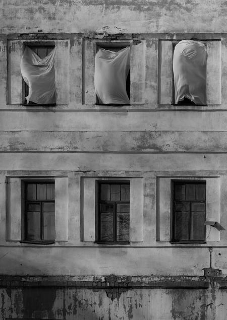 Я превращаю фасад пустого здания в подобие легких, которые совершают размеренные вдохи и выдохи. В нескольких оконных проемах на верхних этажах я закрепляю большие полотна полупрозрачной ткани. За этими полотнами устанавливаются небольшие воздуходувки (вентиляторы). Они работают в медленном ритме, поочередно наполняя тканевые паруса воздухом и вновь отпуская его. Благодаря такому циклу возникает эффект «дыхания» здания: ткань то плавно выпячивается из окна наружу, то мягко опадает внутрь пространства. Каждая такая пульсация — это как вдох и выдох архитектуры. Все окна работают синхронно, в унисон, задавая общий ритм.