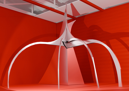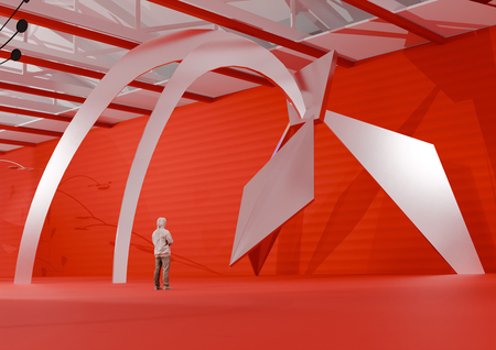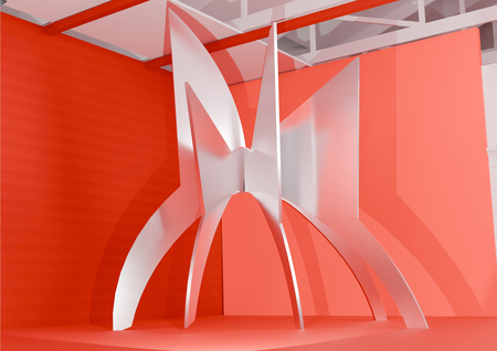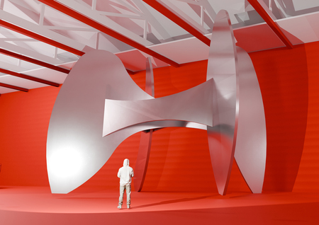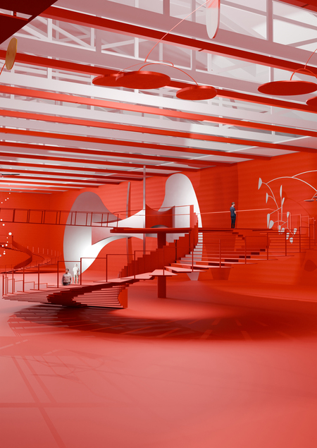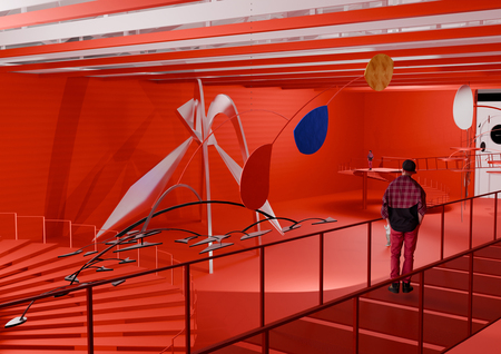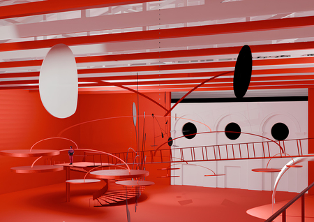 Данная выставка посвящена работам американского скульптора Александра Колдера. За основу я взяла любимый цвет художника — красный. В этом окрасе сделана вся выставка. Также сделан акцент на динамике — основе скульптур Колдера. Винтовые лестницы ведут к подвесным мостам, с которых можно рассмотреть мобили. В момент, когда человек вступает на него, он начинает шататься. Это добавляет выставке динамики. Ярким акцентом являются стабили. В отличие от всей выставки, они белые, что выделяет их.