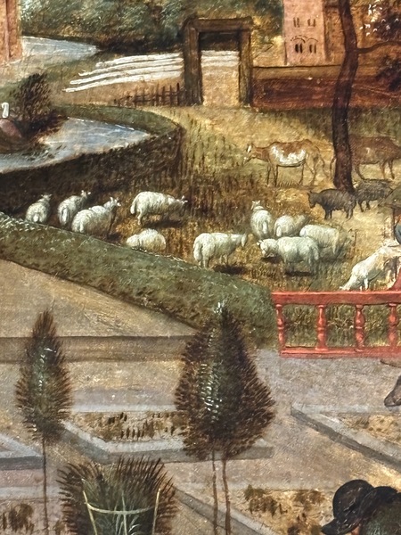 У младшего Брейгеля, как и у Старшего, пейзажу задан высокий горизонт, чтобы создать пространство для многочисленных сцен. Художники рассматривают каждую сцену с близлежащей, слегка приподнятой точки обзора, и, наклоняя поверхность земли в сторону зрителя, придает своим фигурам необычайную монументальность [2]. Передний план картины — пространство труда. С узнаваемой «брегелевской» детализацией (здесь я имею в виду живописную традицию семьи) написаны весенние занятия: не только садоводство, но и стрижка овец.