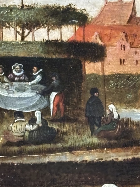 Однако работают не все: задний план по сюжету контрастен. На нем Брейгели изображают куртуазные увеселения — катание на лодках, отдыхающие влюбленные пары, игра на музыкальных инструментах. Эти небольшие сюжеты как бы вынесены «за границы» крестьянского мира [3].