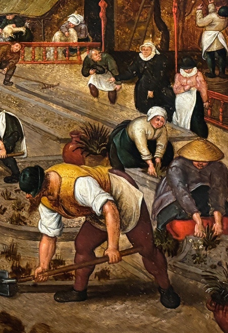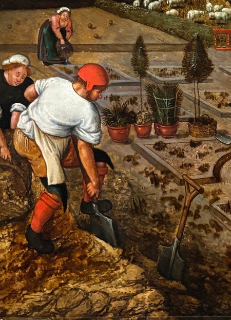 На фламандских полях с картин Питера Брейгеля Младшего во всю кипит работа — крестьяне уже вгрызаются лопатами в холодную землю. «Весна. Работы в саду» (ок. 1600–1605), находящаяся в коллекции Пушкинского музея, представляет считываемый с первого взгляда и понятный пасторальный сюжет. Крестьяне вскапывают землю, сажают растения в подготовленные клумбы, подрезают ветви деревьев и получают наказы от бюргеров (куда без этого).