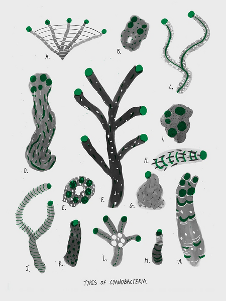 Художник Том Хубманн исследует постантропоценовый мир, где люди вымерли, а доминируют теперь цианобактерии. Его работы наводят на мысли об экологическом коллапсе и последствиях ядерного взрыва, после которого человечество как вид перестанет существовать.