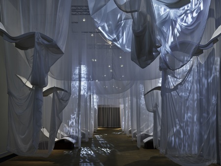 Инсталляция «Pulse Topology» состоит из тысяч лампочек, подвешенных на разной высоте, которые создают серию гребней и впадин — ландшафт, по которому посетителям предлагается прогуляться. Каждая лампочка мерцает в такт пульсу другого участника, что способствует установлению связи.