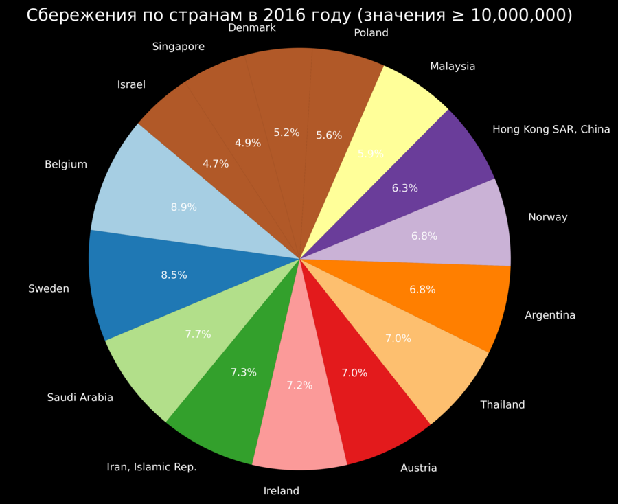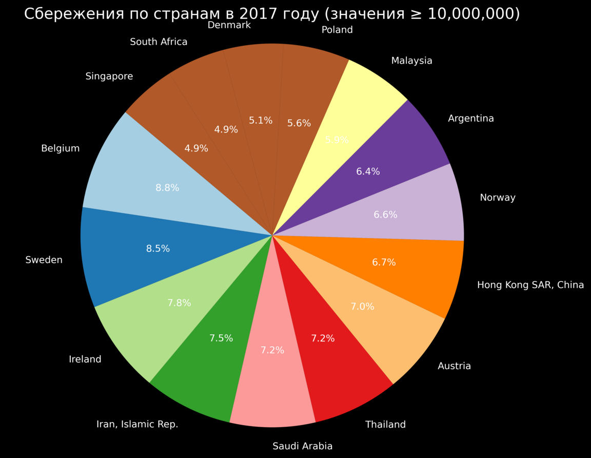 Круговая диаграмма.Сбережения по странам (значения ≥ 10,000,000).
