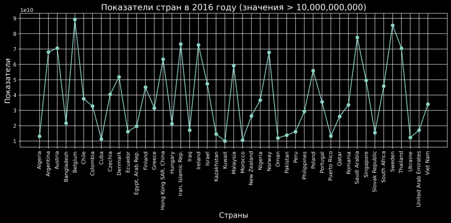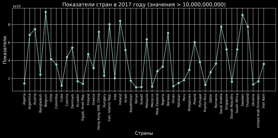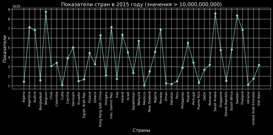 Линейчатая диаграмма.Показатели стран (значения > 10,000,000,000).