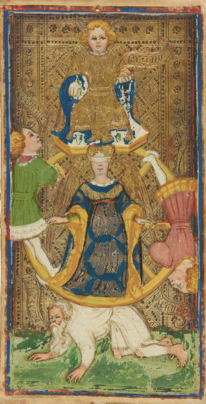 X. Колесо Фортуны — частый аллегорический символ иконографии Европы. Традиционное изображение четырех фигур вокруг «колеса счастья», зародившееся в религиозных трудах, перешло в гадальные колоды.